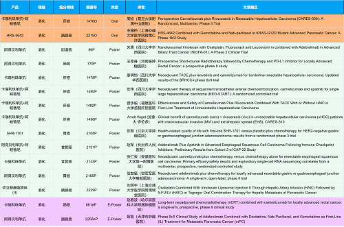 在消化系统肿瘤领域,AG视讯创新产品相关研究共入选2项口头报告、10项壁报和2项电子壁报,共14项研究。除了明星药物卡瑞利珠单抗和阿帕替尼外,还有5篇阿得贝利单抗治疗消化系统肿瘤的研究入选。此外,HRS-4642、瑞拉芙普-α注射液(SHR-1701)等未上市创新产品也有相应研究入选。随着新老药物前沿研究的不断推进,有望为消化系统肿瘤患者带来新的福音!